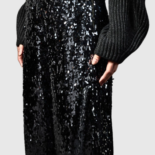 Pantalon palazzo large taille haute entièrement orné de sequins et doté de poches latérales.