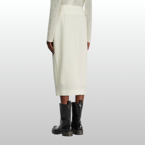 Jupe en laine fraîche. Large fente devant. Fond de robe en crêpe de Chine. Coupe classique, longueur midi.