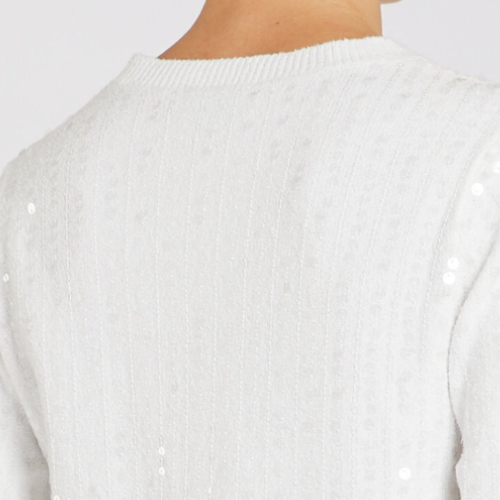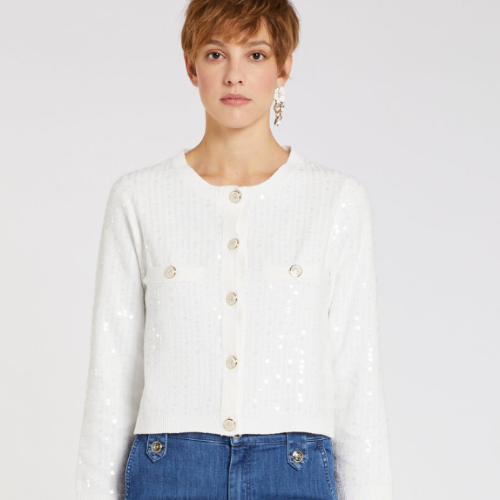 Veste en maille bouclée en mélange de coton extensible avec micro-paillettes - Coupe carrée - Col rond - Fermeture devant par boutons émaillés personnalisés - Poches poitrine passepoilées boutonnées - Ourlet et poignets côtelés